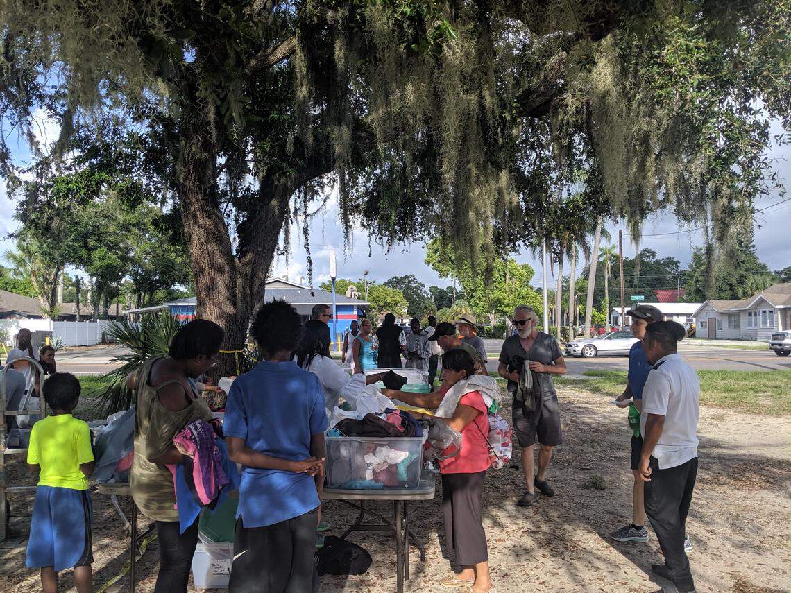 On Thursday night, friendly volunteers stood behind tables loaded with clothes outside of Freedom Gathering Church on 14th Street West in Bradenton. Rows of colorful backpacks full of school and hygiene supplies were stacked alongside.